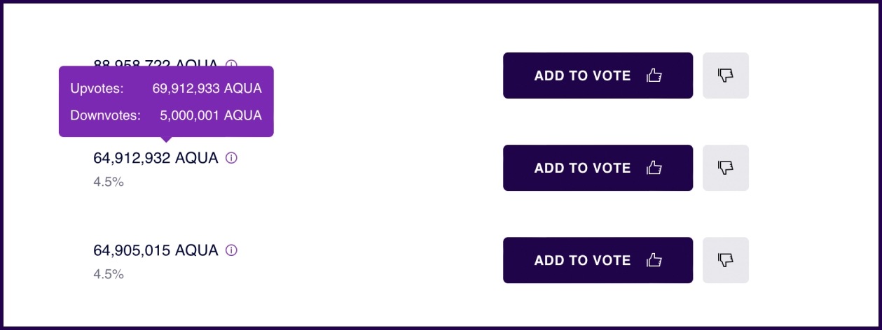 Inside the modal window, you can adjust the amount of AQUA you dedicate towards voting, then break down how much you would like to allocate to each pair. After you have decided, click next to select the Vote Period.