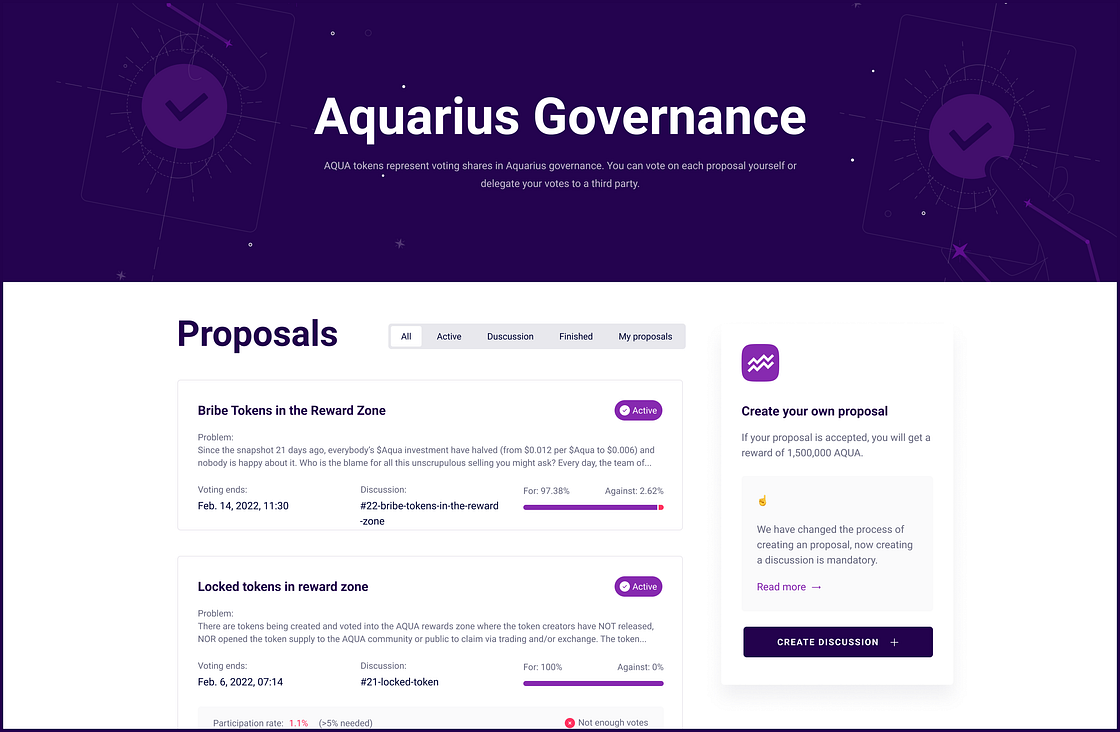 If a proposal reaches quorum (5% participation) and receives over 50% "For" votes, the creator earns a 1.5 million AQUA reward.