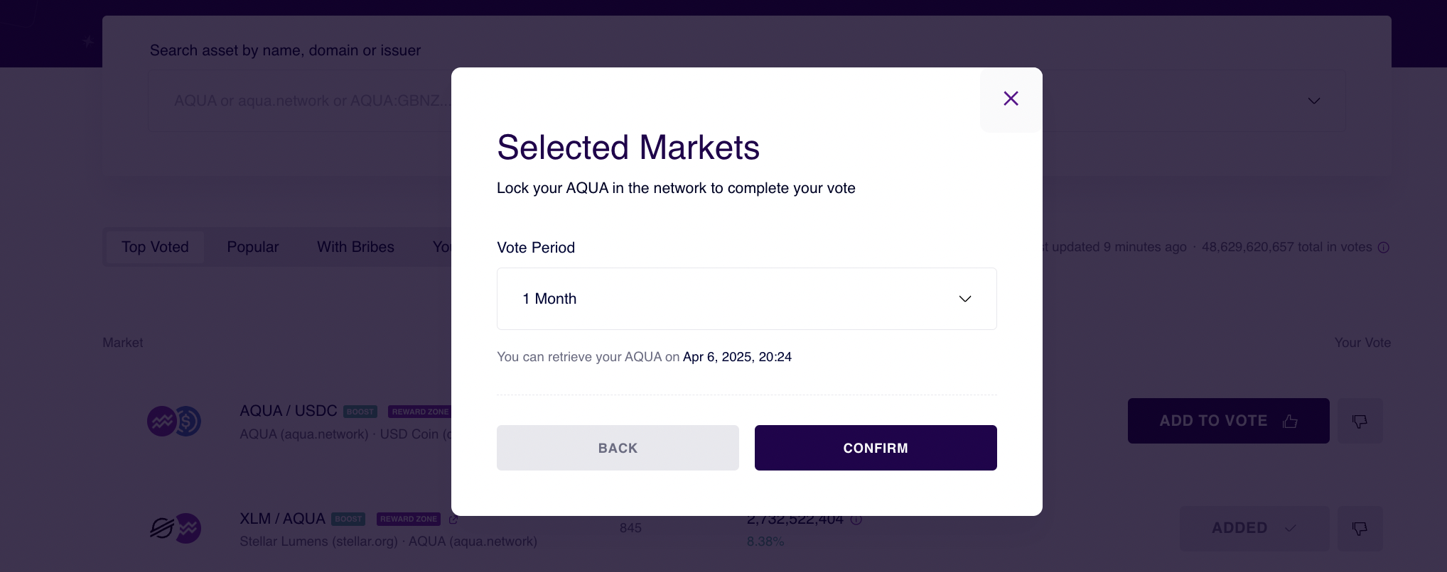 The vote period allows you to lock in votes for various amounts of time, ranging from 1 week to 6 months. Note that your AQUA will stay locked in this market. If you want flexibility and be able to withdraw votes at any time, we suggest that you freeze AQUA into [ICE](https://docs.aqua.network/dashboard/ice-locks) and use the latter for voting.