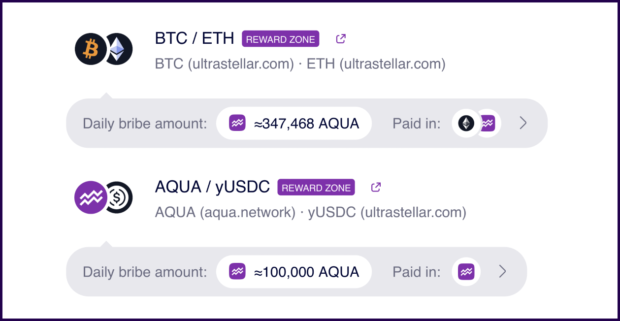 You can find bribes under certain markets. Anyone, mainly project owners, can place bribes upon markets to incentivize AQUA holders to vote for specific pairs in exchange for daily payouts. You can find over upcoming bribes and bribe creation at vote.aqua.network/bribes.