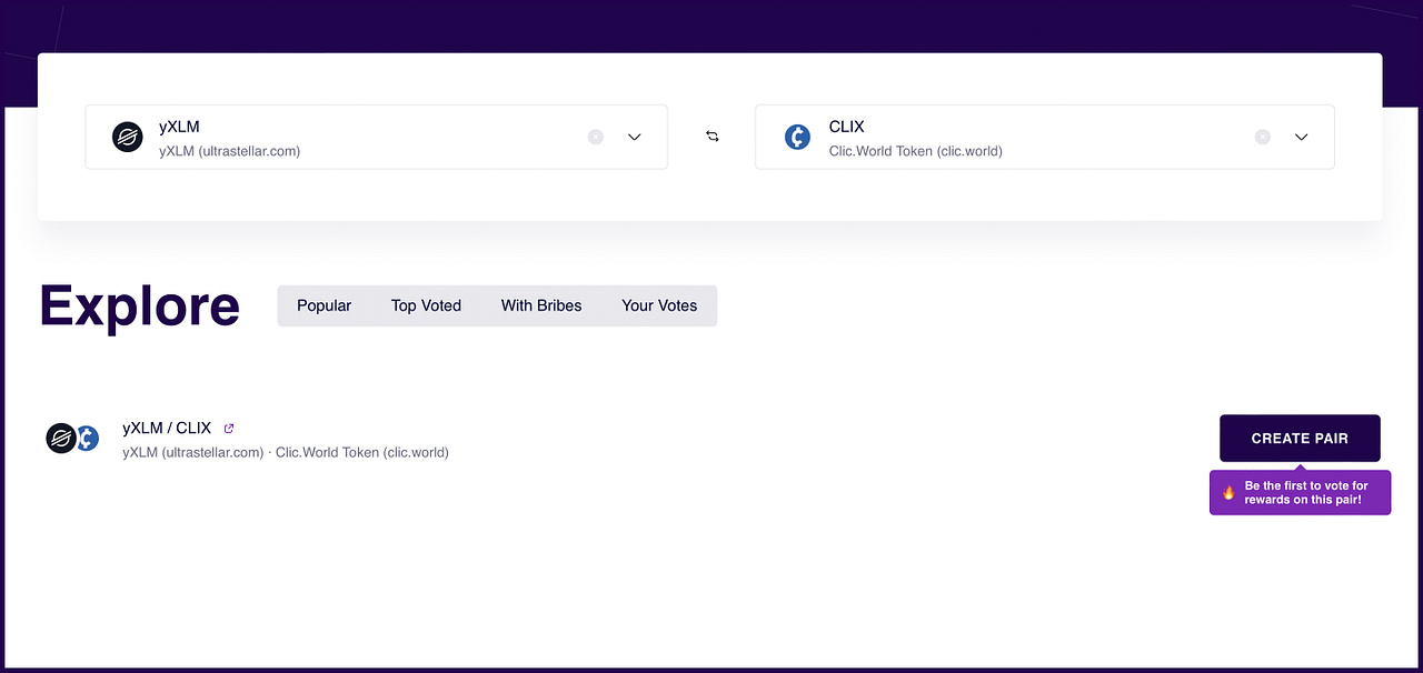 Once inside the voting platform, you can start exploring Stellar market pairs. You can use the tabs to view the most popular pairs, top voted pairs, or pairs with bribes. To add a pair to your vote, click Add To Vote.