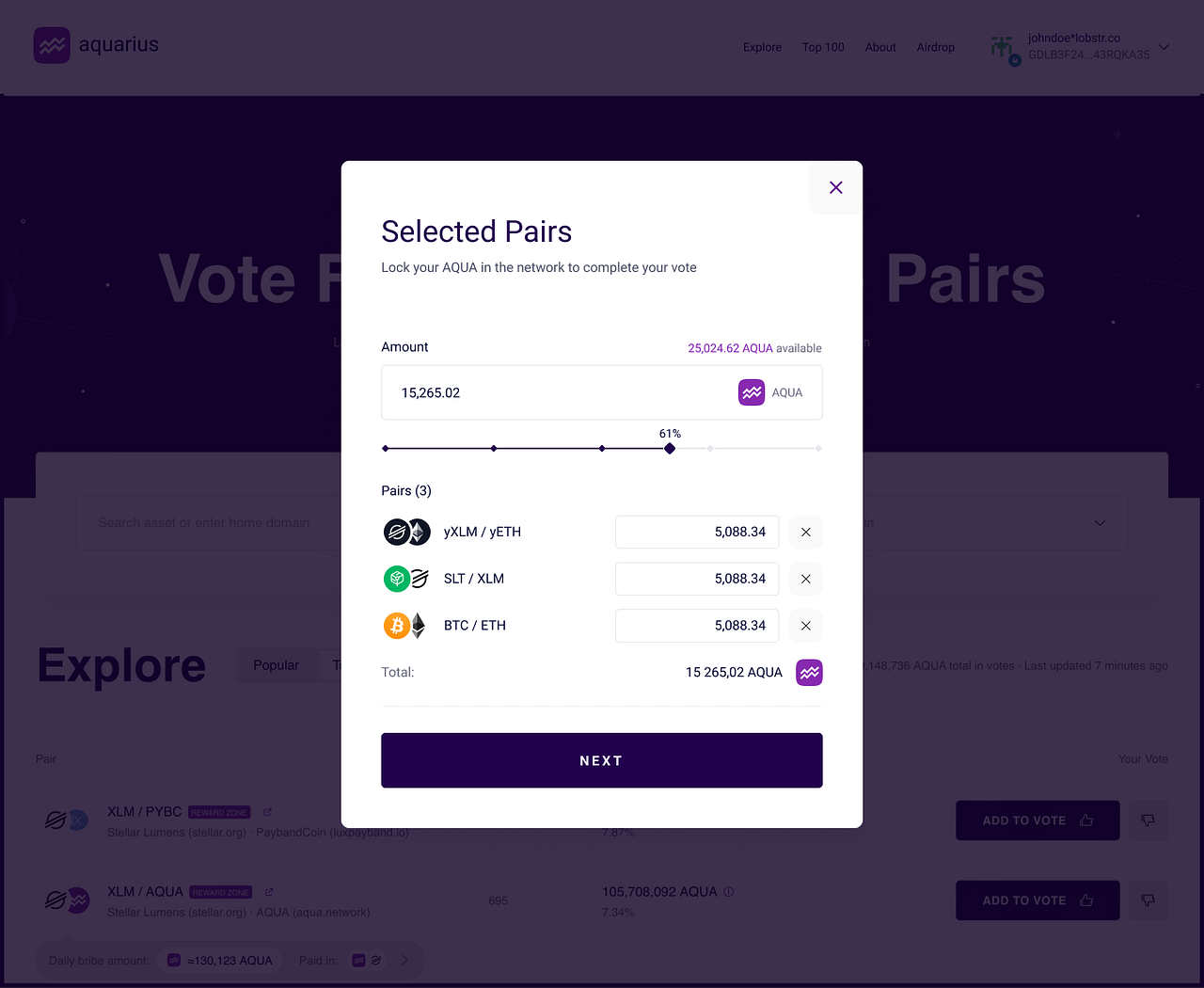 Inside the modal window, you can adjust the amount of AQUA you dedicate towards voting, then break down how much you would like to allocate to each pair. After you have decided, click next to select the Vote Period.